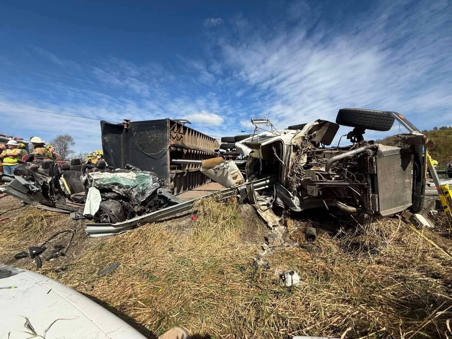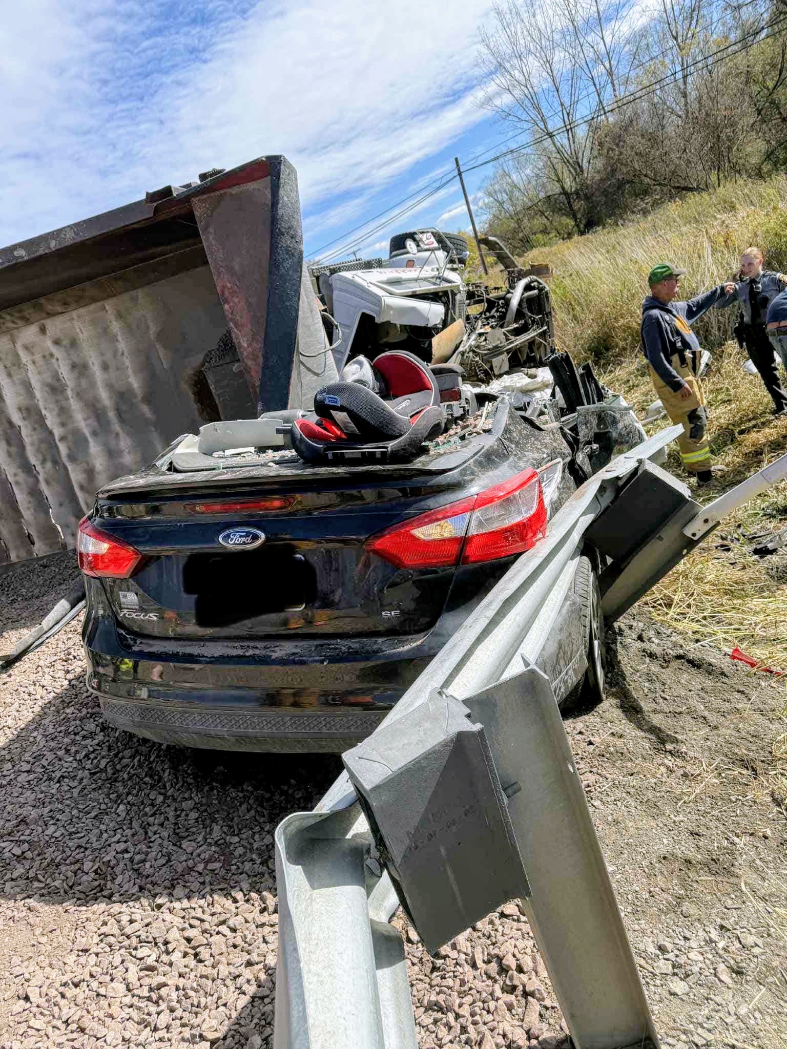 FNN was able to confirm that a dump truck filled with gravel flipped over striking a black Ford Focus carrying three family members. The family and the truck driver were entrapped in their vehicles and each had to be extricated from the vehicles they were in.