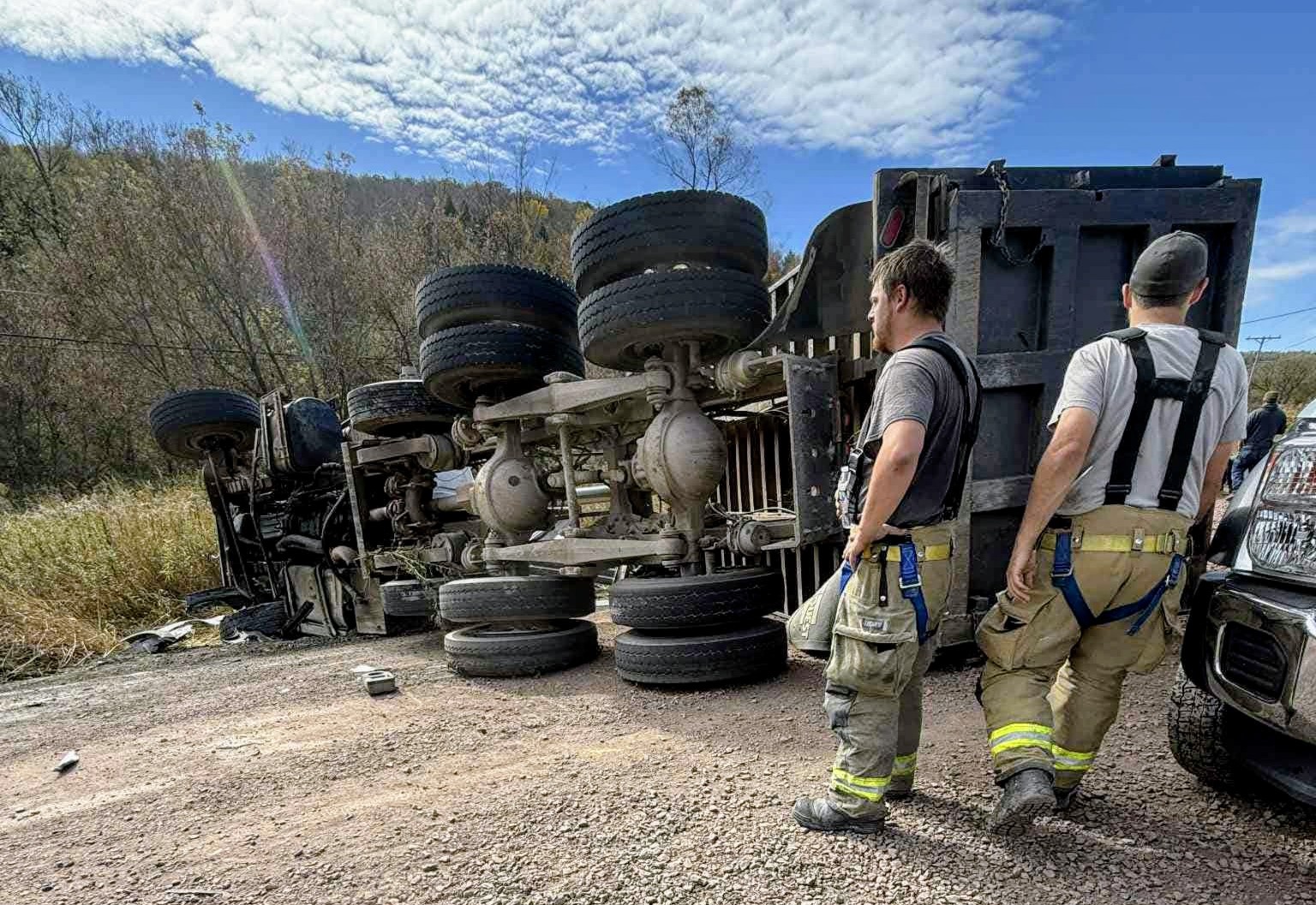 According to Elizabeth Costley, her husband Andy Costley was transported by ambulance to UPMC Wellsboro Hospital after he was extricated from the dump truck. He was treated for a broken foot with dislocated toes, scrapes and lacerations on his back that needed some stitches. Mr. Costley was released that evening. The couple is extremely grateful for the quick response from all the emergency personnel that attended to everyone involved in this terrible accident.