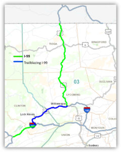 The department is in the final stage of seeking Federal Highway Administration (FHWA) approval to designate this roadway section as I-99. If approved, the current U.S. 15 between the City of Williamsport in Lycoming County, and the New York state border in Tioga County, will become I-99.