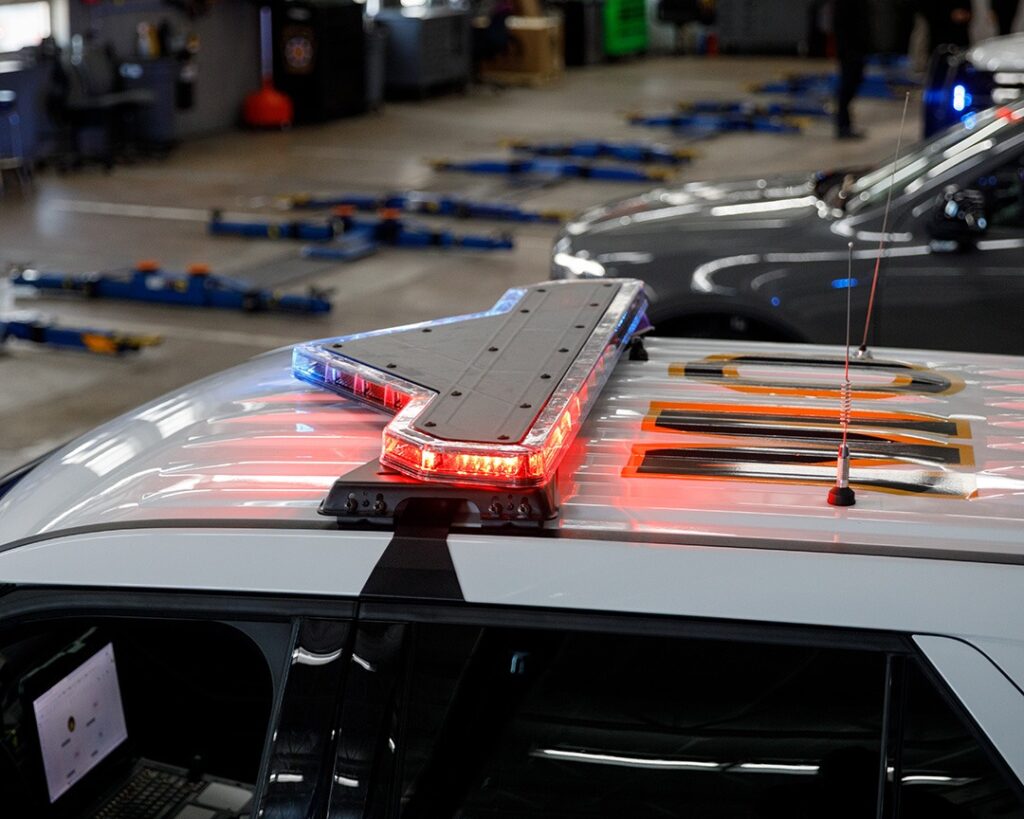 The upgrades include a distinctive V-shaped light bar that provides full 360-degree illumination, dramatically increasing visibility compared to traditional linear bars. The system features GPS‑based vehicle‑to‑vehicle communication that automatically synchronizes flash patterns and voice commands among nearby patrol units, improving coordination and safety at emergency scenes. The light bar functions as an auxiliary brake light during hard braking, an arrow board for traffic control, and a floodlight for use in dark, hazardous environments. In low-light conditions, when the vehicle is parked, an automatic dimming feature enhances vision at night and reduces glare.